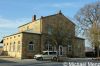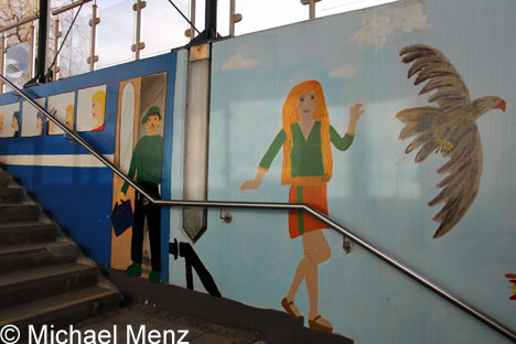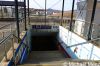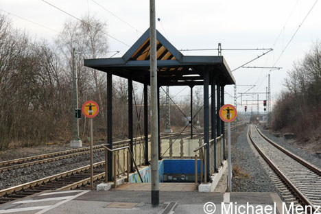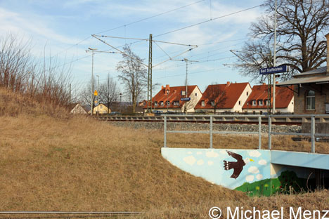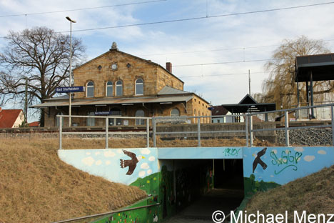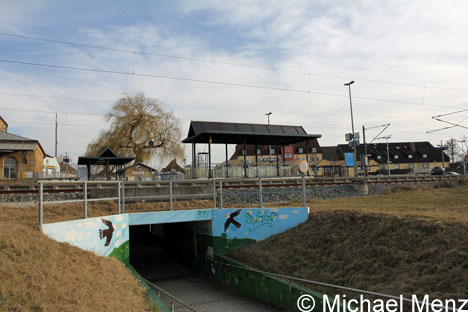 Vom quaderförmigen Bahnhof gibt es eine Fußgängerunterführung
