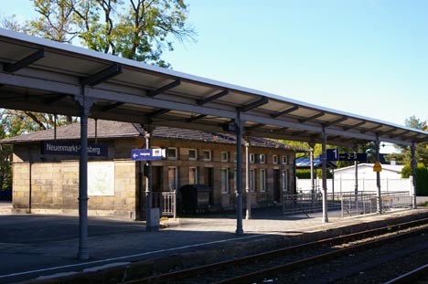 Der Bahnhof Neuenmarkt-Wirsberg liegt direkt an einer der berühmtesten deutschen Bahnstrecken – der Schiefen Ebene. Sie ist Teil der Ludwig-Süd-Nord-Bahn und überwindet auf einer Länge von nur acht Kilometern einen Höhenunterschied von 158 Metern. Am unteren Ende liegt der Bahnhof Neuenmarkt mit 349 m ü. NN, am oberen Ende der Bahnhof Marktschorgast mit 507 m ü. NN.