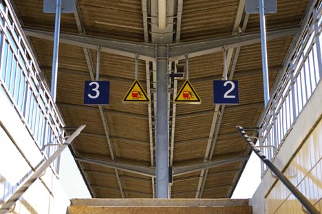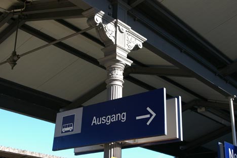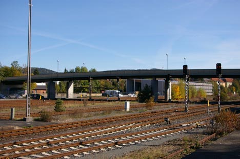 Da der Fußgängerweg vom Autoverkehr abgetrennt ist, kann der Betrachter nahezu ungestört auf der Brücke verweilen und einen Blick zurück auf den Bahnhof werfen: