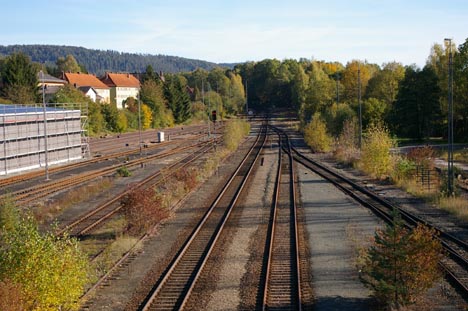 Vom parallel gegenüberliegenden Fußweg sieht man die Gleise, die Richtung Hof und Bayreuth führen und das Deutsche Dampflokmuseum mit dem Schienenverkehr der DB AG verbinden.