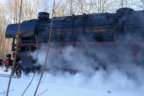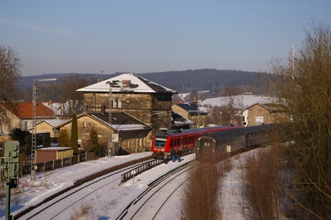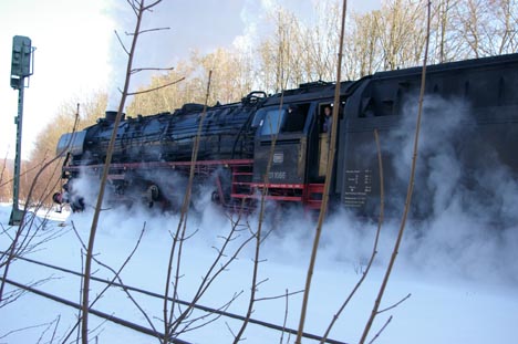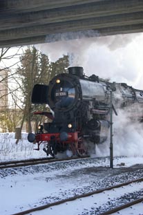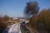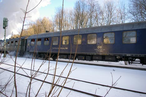Am 12.2.2012 besuchte 01 1066 der Ulmer Eisenbahnfreunde die Schiefe Ebene. Neben einem Speisewagen zog die Dampflokomotive drei Schnellzugwagen.