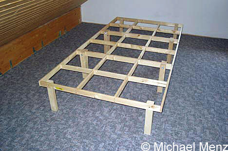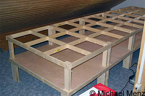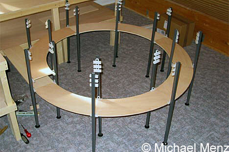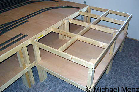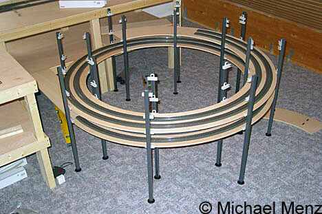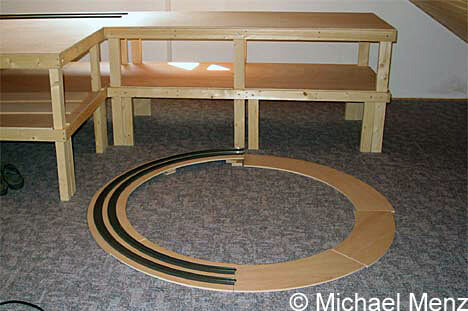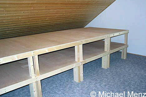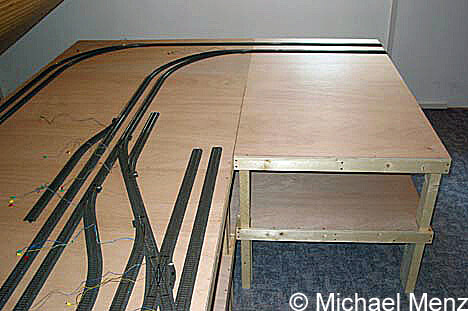 Als Gerüst für die Modelleisenbahn wurde ein stabiler Gitterholzrahmen in L-Form zusammengebaut, welcher die 8 mm dicken Spanplatten trägt. Parallel dazu wurden die ersten Schienen aus dem C-Gleis-Sortiment von Märklin verlegt.
