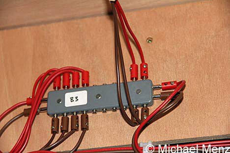 Danach wurden die Schienen der drei Schattenbahnhöfe angeschraubt und es wurde mit der Verkabelung der Modelleisenbahn begonnen. Für die Versorgung der Schienen mit Bahnstrom wurden fünf Ringleitungen verlegt und an eine POWER-10 angeschlossen.